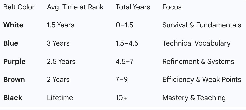 Age and Athleticism: While BJJ is for everyone, a 22-year-old athlete training twice a day will naturally progress differently than a 45-year-old hobbyist with a desk job.